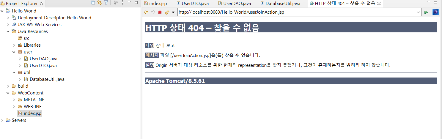 현재는 userJoinAction.jsp를 만들지 않았기에 다음과 같이 404(Not Found)가 반환되었다.