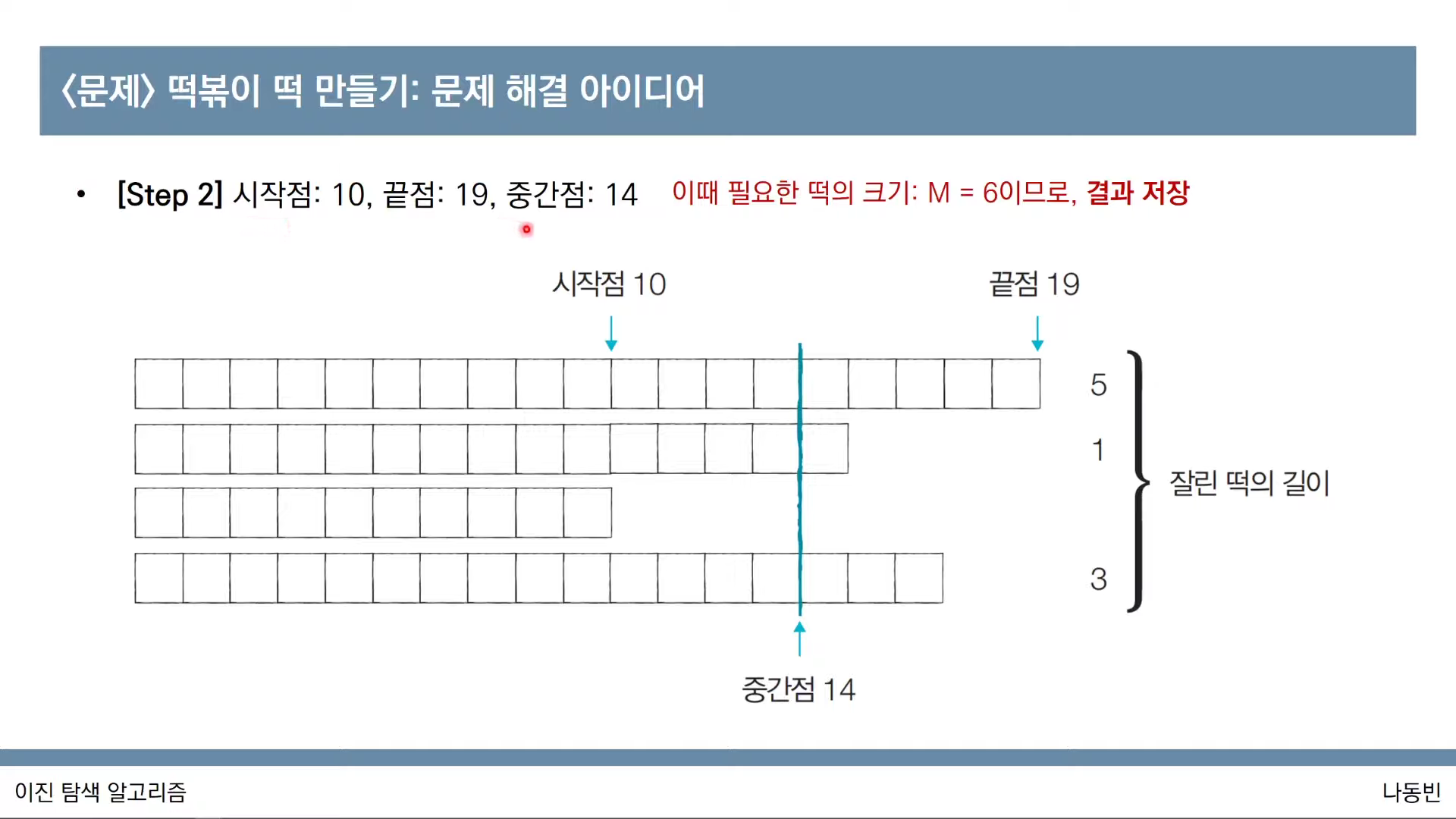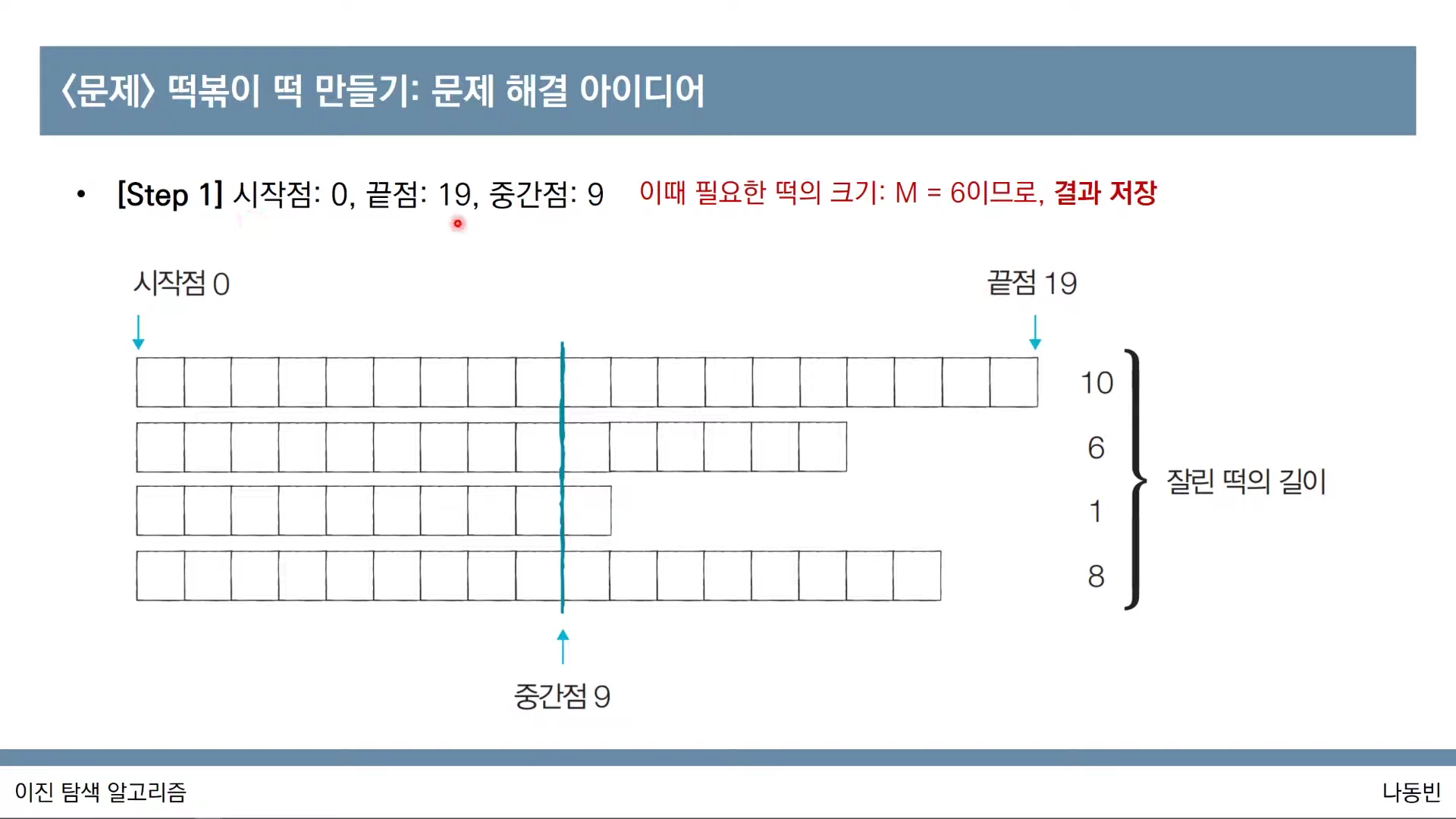 - 중간점의 값은 시간이 지날수록 최적화된 값이 되기 때문에, 과정을 반복하면서 얻을 수 있는 떡의 길이 합이 필요한 떡의 길이보다 크거나 같을 때마다 중간점의 값을 기록하면 됩니다.