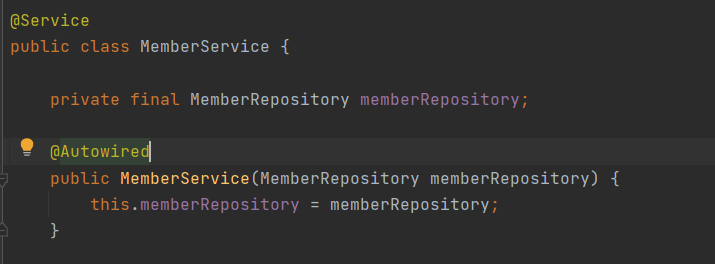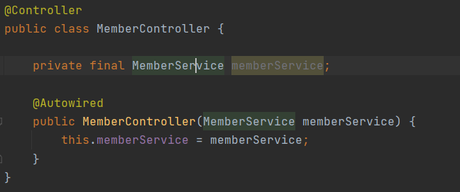 - 생성자에 @Autowired 가 있으면 스프링이 연관된 객체를 스프링 컨테이너에서 찾아서 넣어준다.