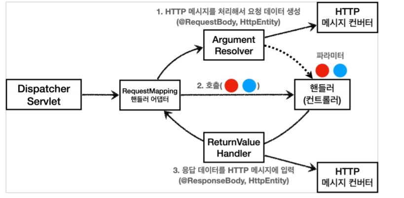 애노테이션 기반 컨트롤러를 처리하는 RequestMappingHandlerAdaptor는 ArgumentResolver를 호출해서 컨트롤러(핸들러)가 필요로 하는 다양한 파라미터의 값을 생성하고 준비된 파라미터들은 컨트롤러에게 넘겨준다. (스프링은 30개가 넘는 ArgumentResolver를 기본으로 제공)
