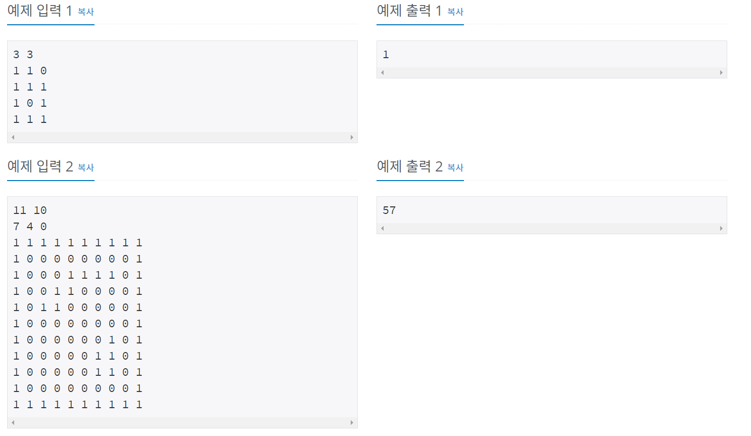 셋째 줄부터 N개의 줄에 장소의 상태가 북쪽부터 남쪽 순서대로, 각 줄은 서쪽부터 동쪽 순서대로 주어진다. 빈 칸은 0, 벽은 1로 주어진다. 지도의 첫 행, 마지막 행, 첫 열, 마지막 열에 있는 모든 칸은 벽이다.