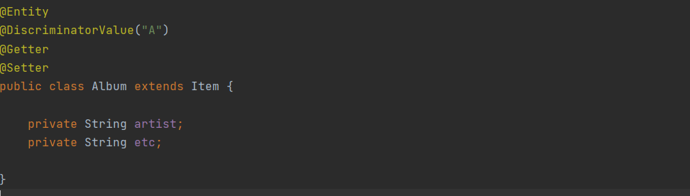 - @Inheritance(strategy = InheritanceType.SINGLE_TABLE) 을 사용하여 하나로 통합할 것임.