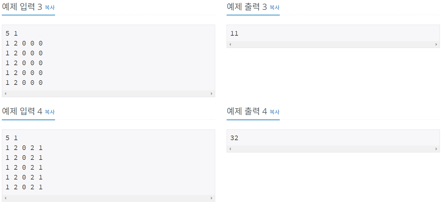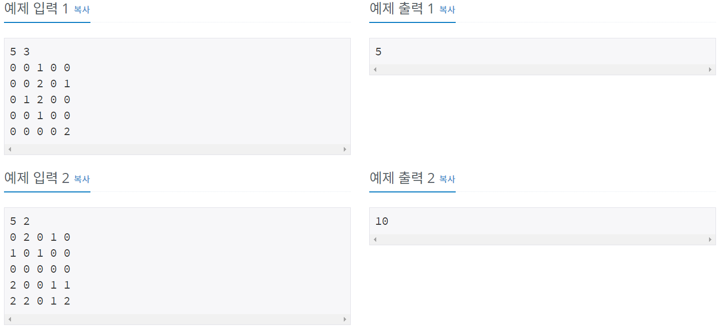 첫째 줄에 N(2 ≤ N ≤ 50)과 M(1 ≤ M ≤ 13)이 주어진다.