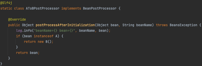 A를B로 후킹했기 때문에 "beanA"라는 스프링 빈은B타입일 것이다. - 만약