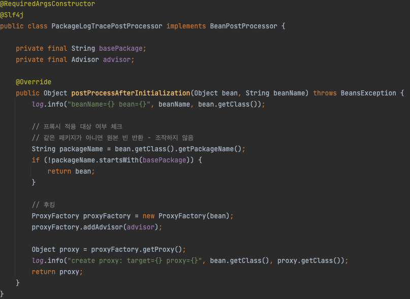 - 지정된 패키지에 존재하는 빈 객체라면 프록시를 생성해 이를 반환해 실제 빈 객체로 등록해주는 후킹 작업을 하는 빈 후처리기이다.