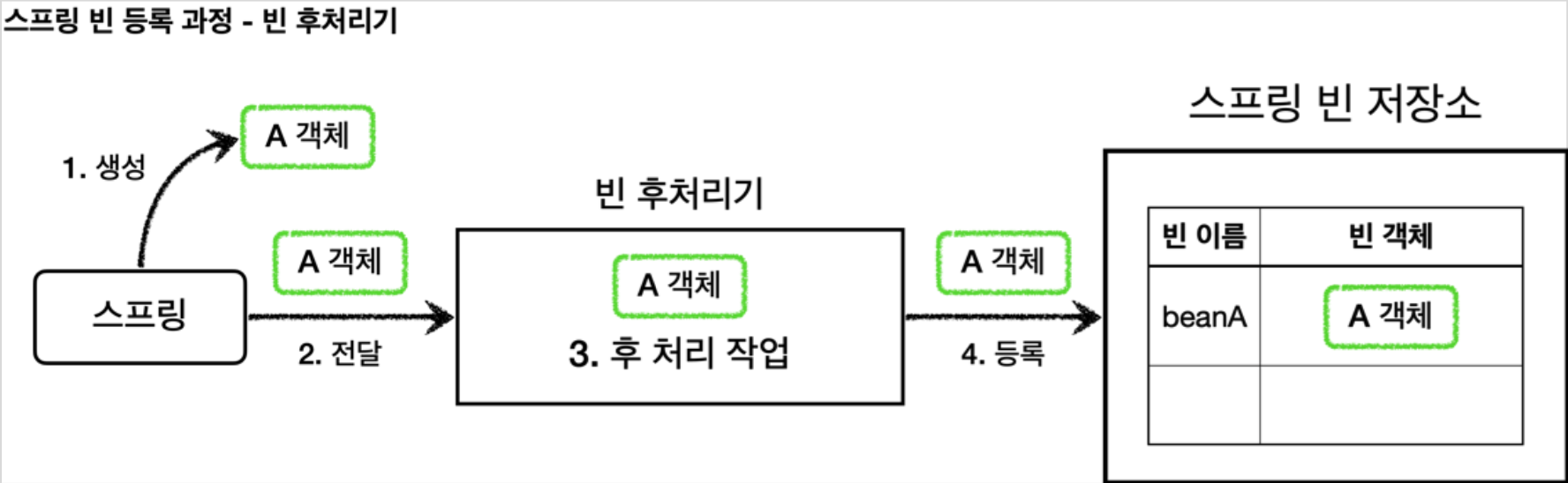 A타입의beanA라는 스프링 빈이 싱글톤으로 생성된다. - 그 후, 빈 후처리기에 이 객체가 전달된다.