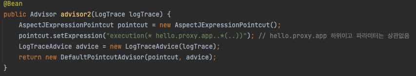 *: 모든 반환 타입hello.proxy.app..: 해당 패키지와 그 하위 패키지*(..):*모든 메서드,(..)파라미터는 상관없음