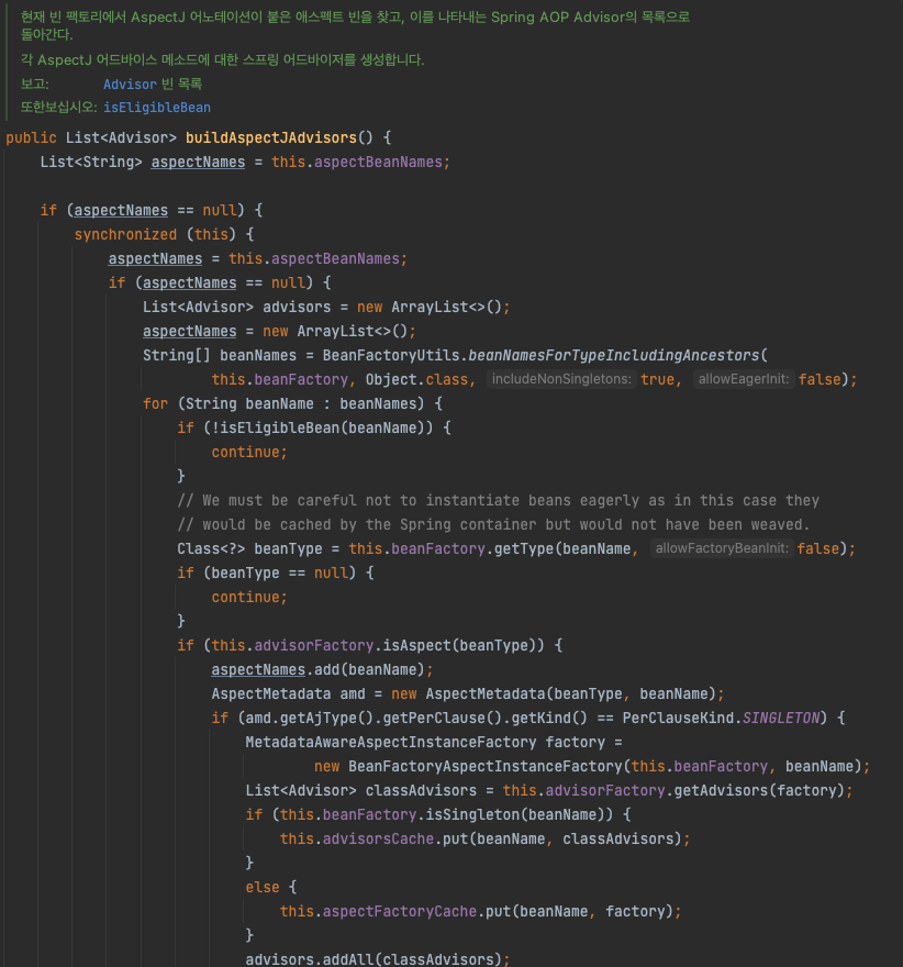 @Aspect를 보고 Advisor를 생성하는 것은 Advisor Builder가 담당하는데 내부 구현을 뜯어보니 아래 메서드에서 이 로직을 수행하고 있는 듯 하다.